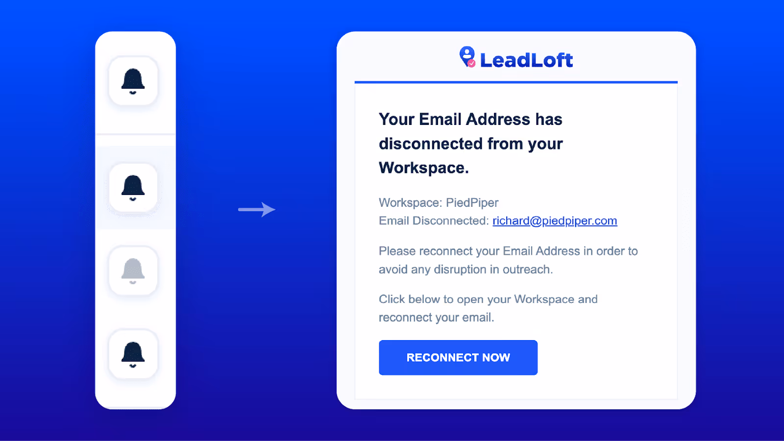 Instead of wondering why a customer or client has fewer leads than normal, you can click the bell icon to get notified every single time an email or LinkedIn account gets disconnected, ensuring there's never any disruption in outreach.