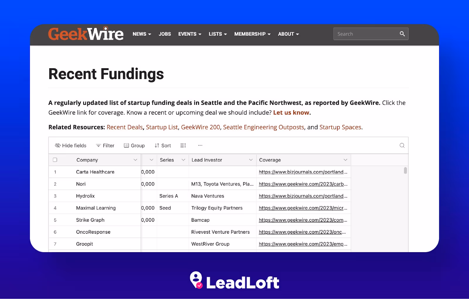Similar to Crunchbase, GeekWire's list of recently funded startups is super useful when searching for startups that have just been funded. It outputs all the information into a spreadsheet, which makes it really easy to consume and organize. Even better, GeekWire's list of recently funded startups is completely free and open to the public. So, unlike Crunchbase, you're not going to have to pay for a subscription to access the data.