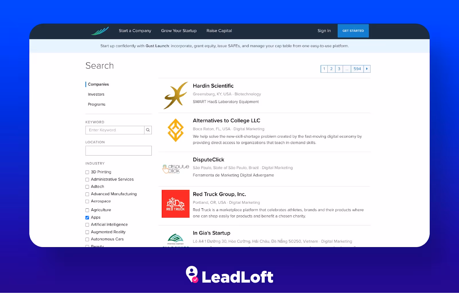Gust Launch is generally used for founders looking to raise capital, but it can also be great for reaching out to startups. On their website, they have a directory of many startups that have signed up. You can hop in there, search for new startups, and discover those that may be looking to raise capital. So, if you work at a VC firm or a startup that offers fundraising services, this is most likely an awesome resource for you and your team.