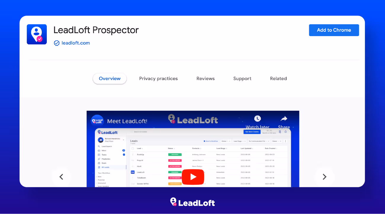 To save prospects, we need the LeadLoft Chrome extension installed. If you don't have it installed, you can install it here.