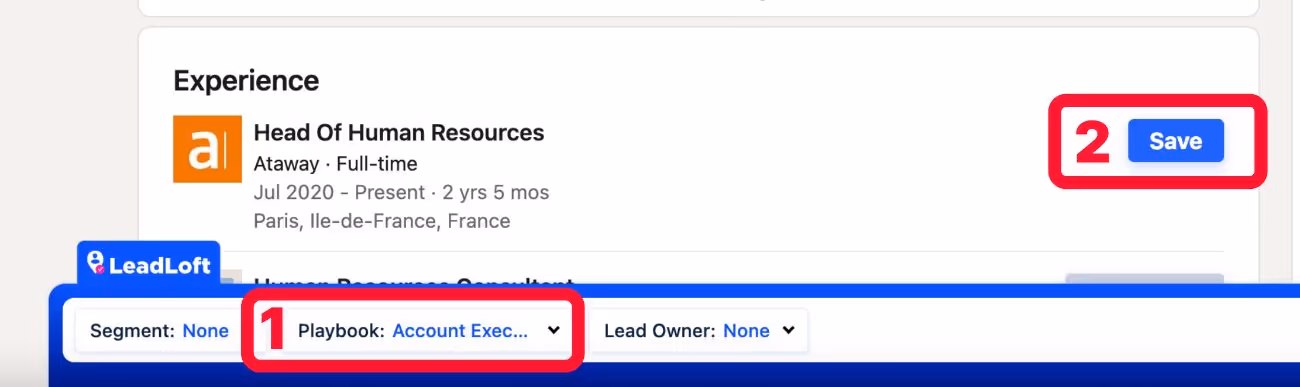 After you’ve found someone that you’d like to reach out to, open their profile, select the correct Playbook, and click “Save” using the LeadLoft Prospector.