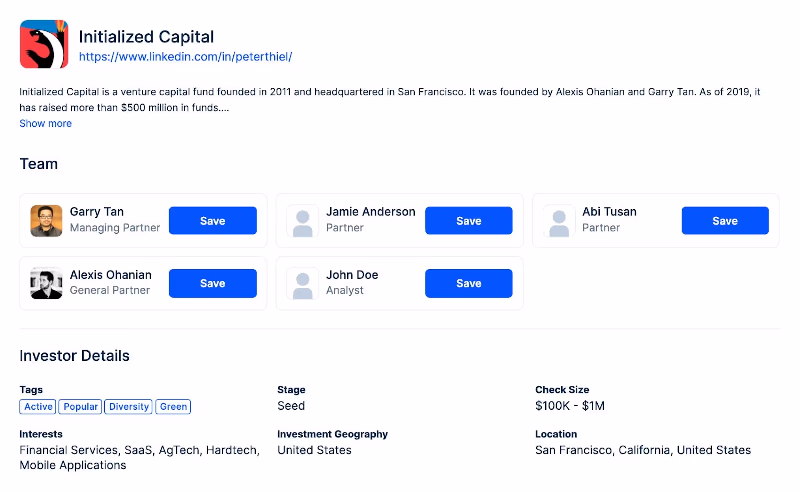 This is where we recommend using LeadLoft’s investor database. You can search and sort through the database to find investors who have invested in your industry in the past. We generally recommend saving multiple partners at every company that you’re planning on reaching out to so you can save time down the road if one partner fails to respond.