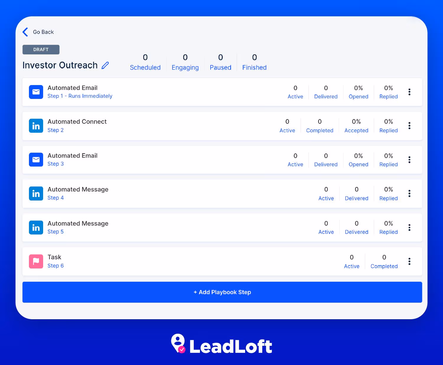 LeadLoft is ideal for fundraising because it’s an all-in-one solution that includes an investor database, outreach playbooks (Email & LinkedIn automation), and a simple CRM to track all of your investor conversations.