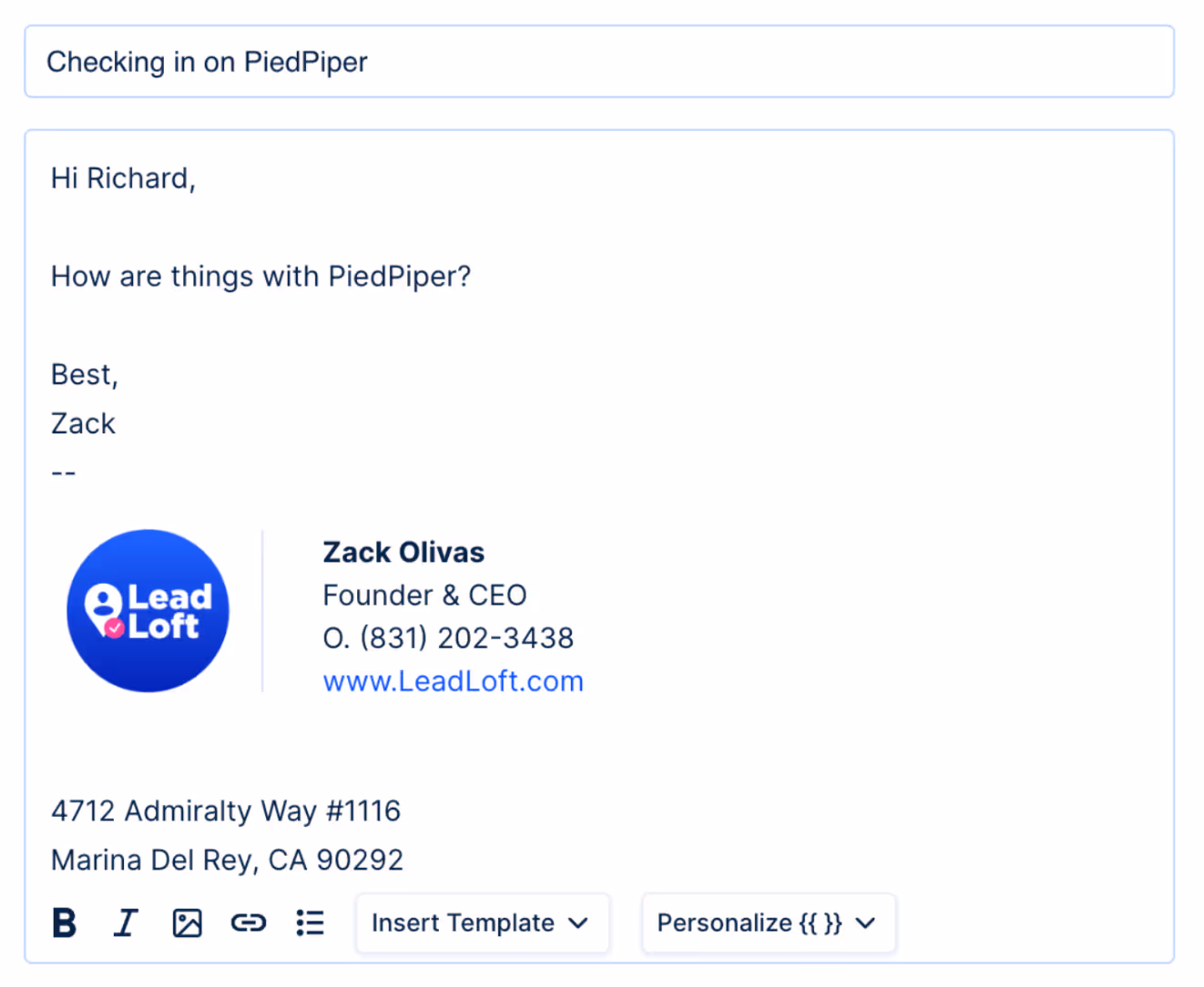You can achieve this by using Personalization tags in LeadLoft. These tags will insert information about the prospect, their company, and even you (the sender).