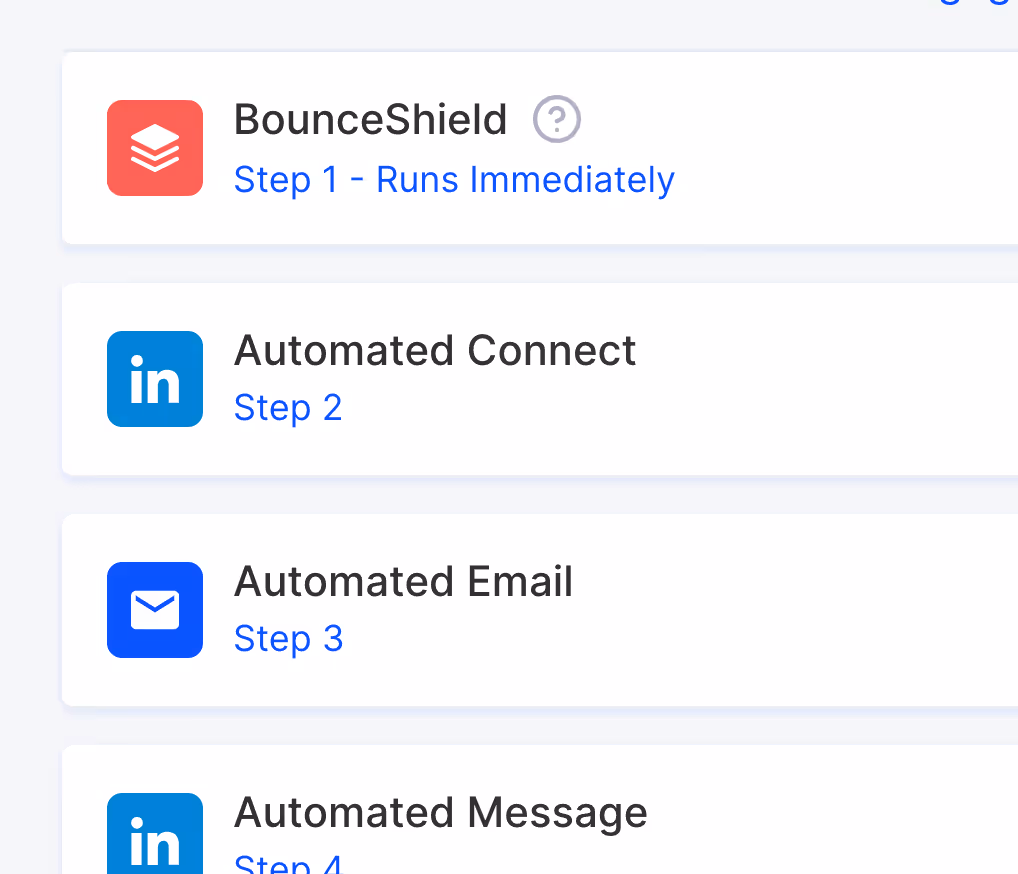 Another option is using LeadLoft’s BounceShield email verification feature. You can add this BounceShield step as the first step in your playbook, ensuring every email is verified from the start of your outreach.