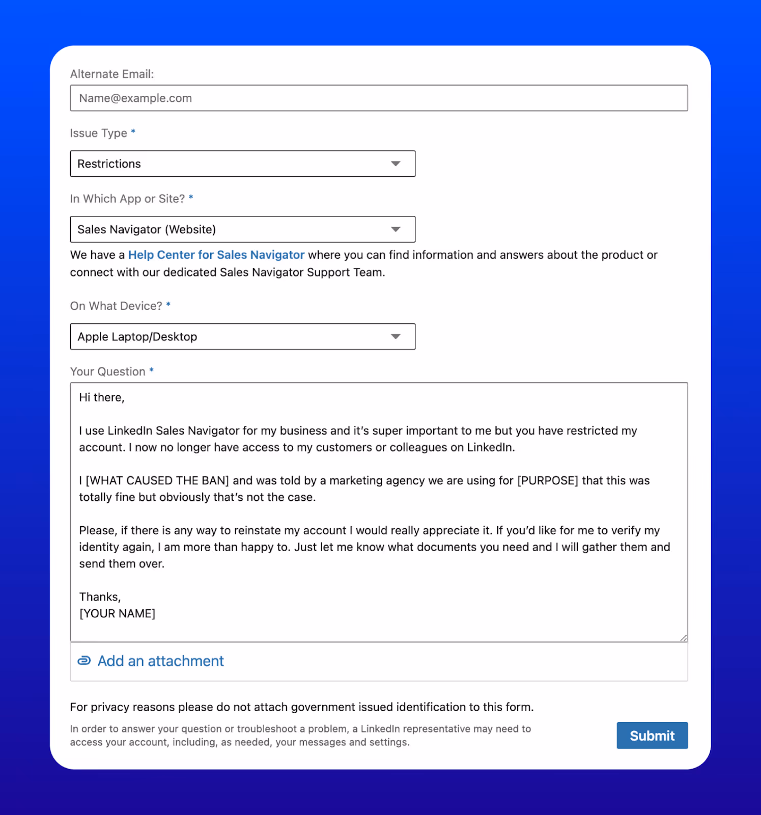 I use LinkedIn Sales Navigator for my business, and it’s super important to me, but you have restricted my account. I no longer have access to my customers or colleagues on LinkedIn.