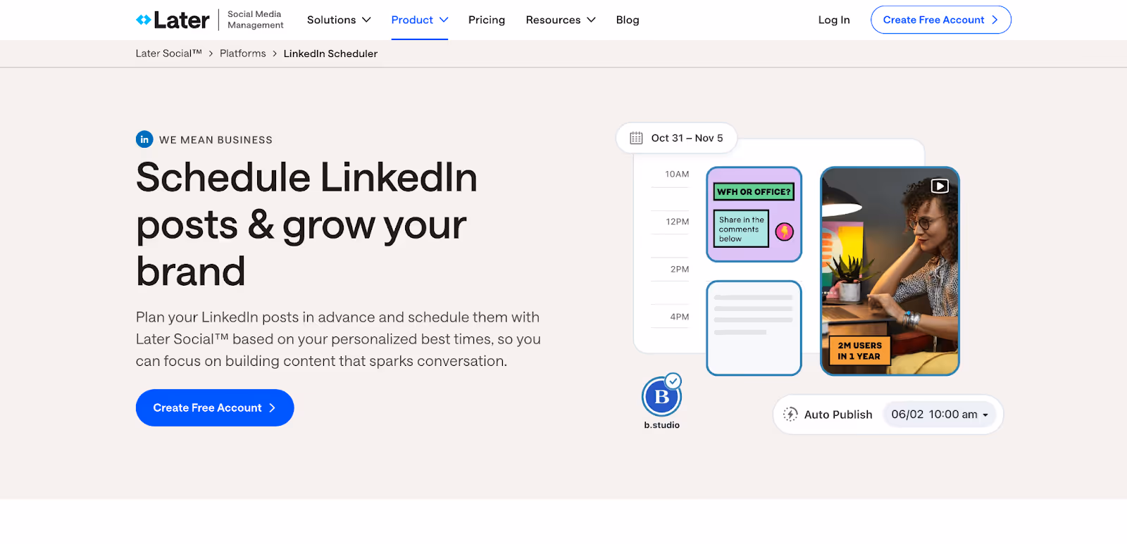Later.com is known for its visual content calendar, making it easy to schedule LinkedIn posts alongside other social media platforms. Its drag-and-drop interface is intuitive, and it offers a variety of features such as media management, analytics, and content suggestions. The free plan is great for beginners, and the paid plans are reasonably priced, starting at $12.50 per month.