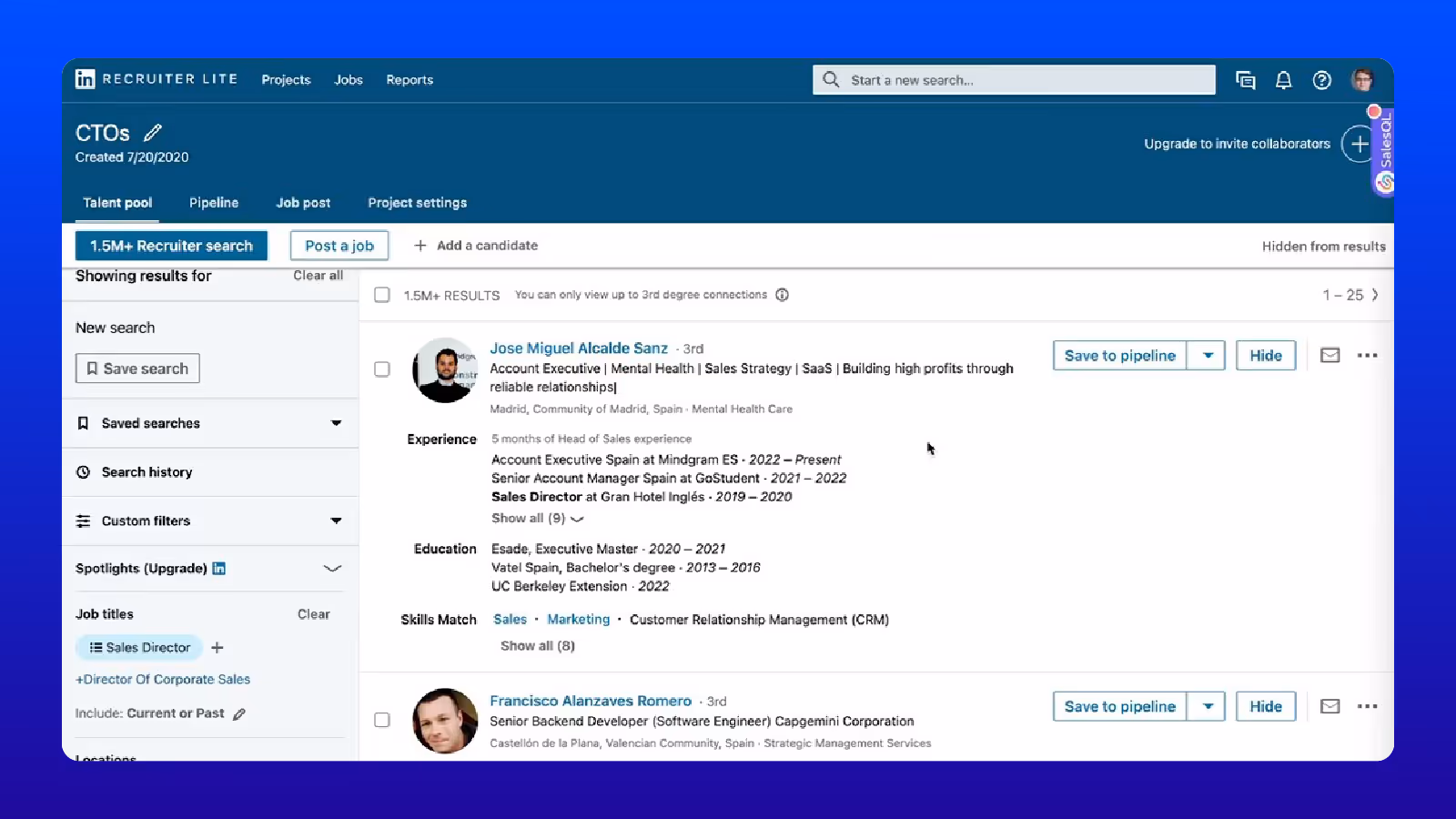 Sales Navigator’s advanced lead filters and insights make it easy to find candidates who fit your criteria, and its integration with LinkedIn keeps everything in one place.